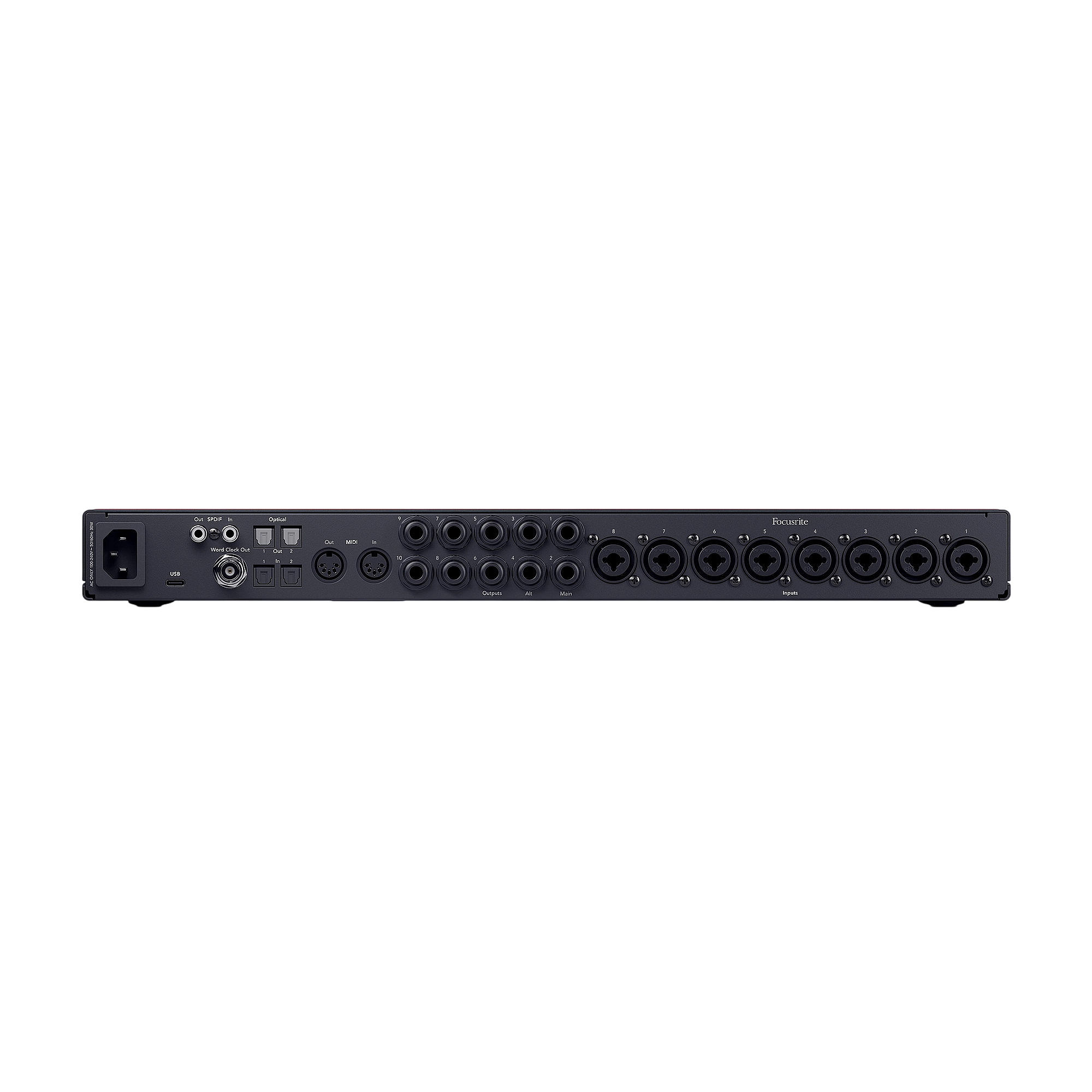| Overview | Number of Microphone Preamps 8 Phantom Power Yes (Independent) Instrument Inputs 2 Line Inputs 8 Air Mode Yes Auto Gain Yes Clip Safe Yes Line Outputs 10 Headphone Outputs 2 ADAT Inputs 2 (16 channels at 44.1/48kHz and up to 8 channels at 96kHz) ADAT Outputs 2 (16 channels at 44.1/48kHz and up to 8 channels at 96kHz) SPDIF Inputs 1 SPDIF Outputs 1 MIDI Inputs 1 MIDI Outputs 1 Talkback Yes Loopback Yes Connectivity USB Type-C Protocol USB 2.0 Form Factor Desktop / Rack Mountable (1U) Simultaneous I/O 26 x 26 A/D Resolution 24-bit/192 kHz Bus Powered No |